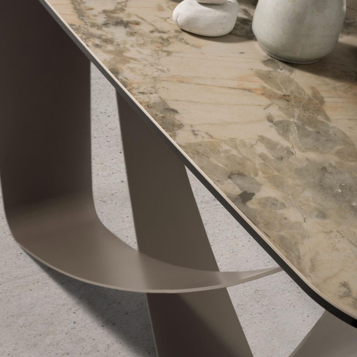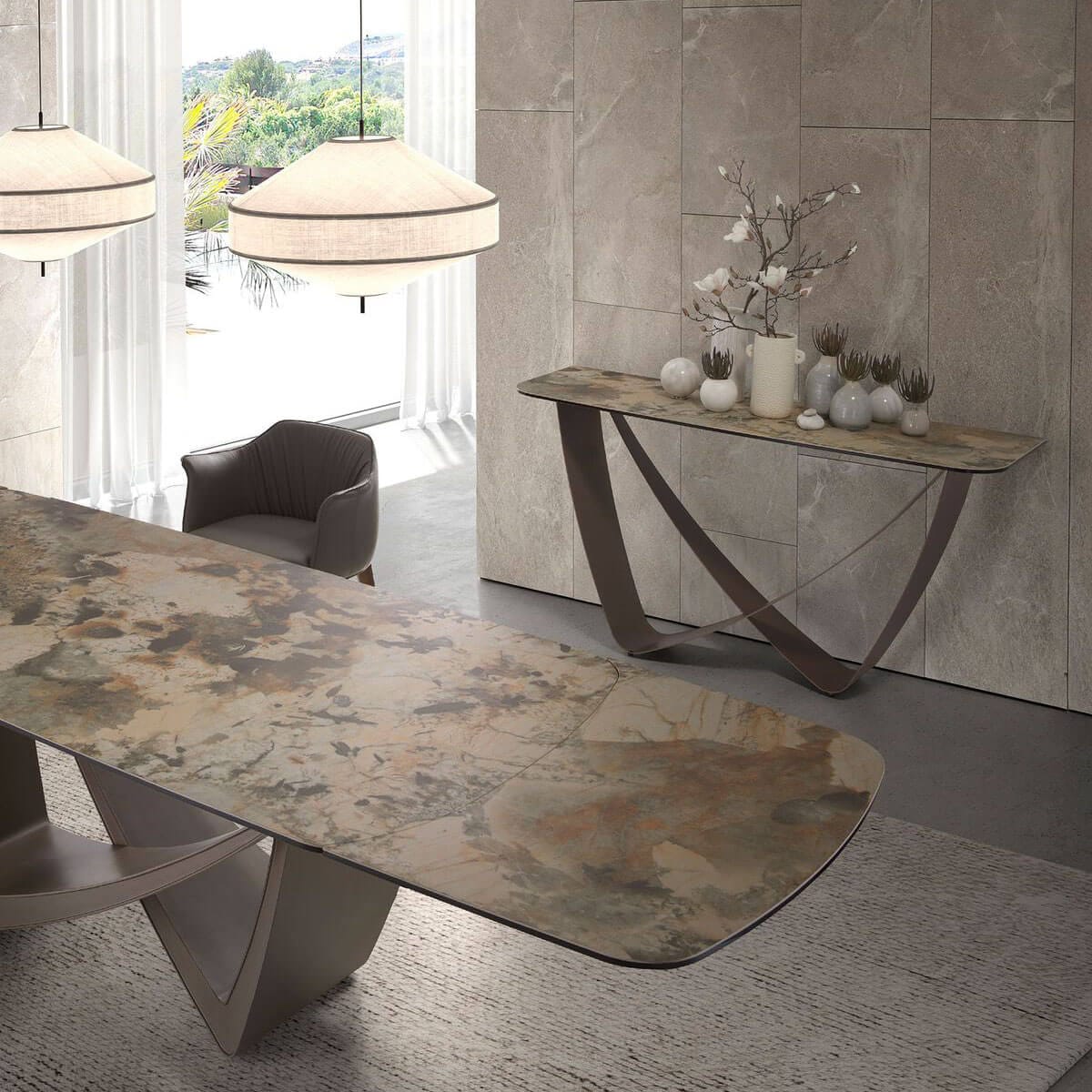 Modern téglalap alakú konzolasztal porcelán márványlappal, matt föld és szürke árnyalatokban, valamint eredeti, bézs metálfényűre festett rozsdamentes acél lábakkal. Egy egyszerű, mégis eredeti dizájnú darab, amely egyedi és személyes jelleget kölcsönöz neki.
