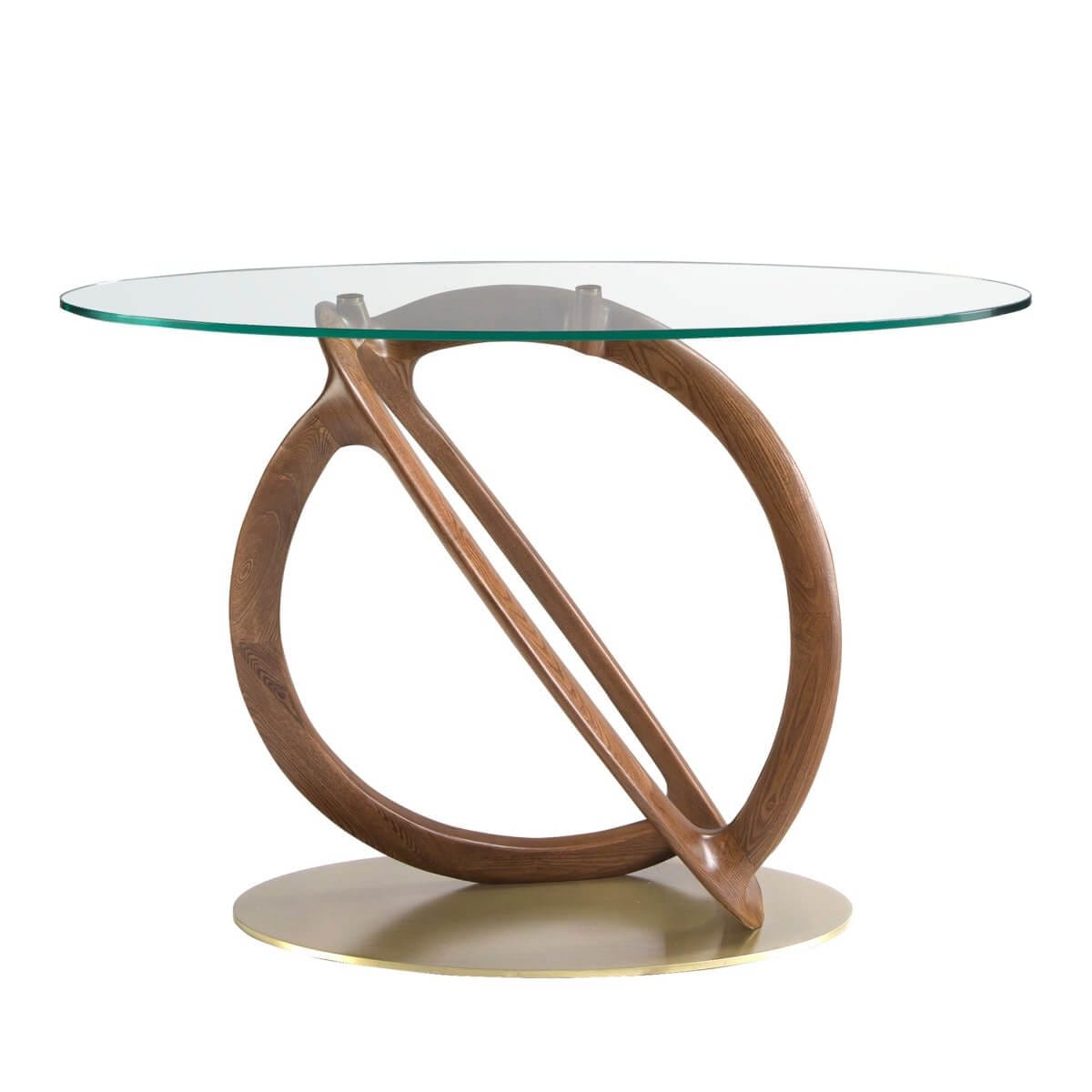 Modern ovális konzolasztal edzett üveglappal és eredeti dió színű fa lábakkal. Ez a polírozott rozsdamentes acél talppal ellátott, arany színű konzolasztal tökéletes otthonába, hogy fényt és avantgárd stílust vigyen.