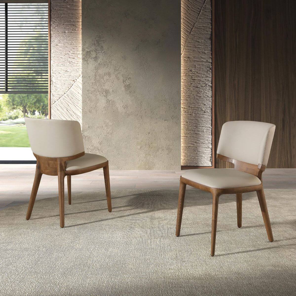 Modern dizájnú szék krémszínű műbőrrel kárpitozott ülőfelülettel és háttámlával. Dió színű, avantgárd, mégis időtlen stílusú fa lábai kötelező darabbá teszik konyhájában vagy étkezőjében.