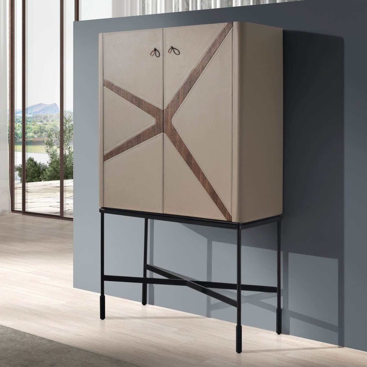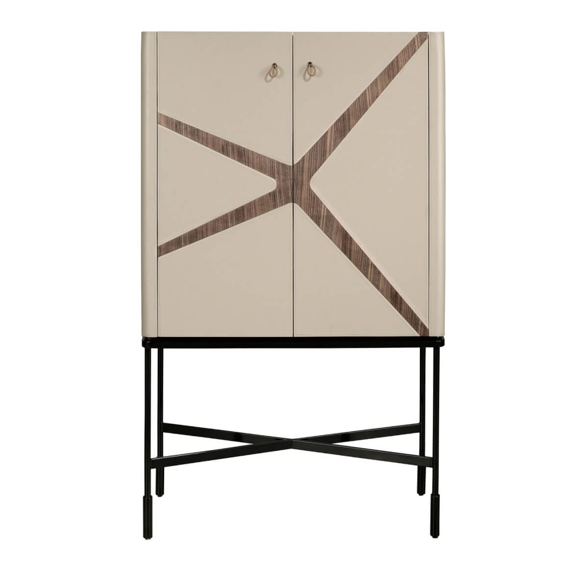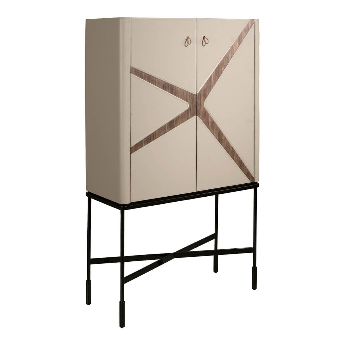 Modern dizájnú, magas tálalószekrény natúr diófa furnérral borított fa szerkezettel, nerc színű marhabőrrel kárpitozva és eredeti fekete rozsdamentes acél lábakkal. Nagy tárolóhellyel rendelkezik, 1 húzófüles nyitó- és lágyan záródó fiókkal, valamint 2 húzófüles nyitó- és zárórendszerű ajtóval.