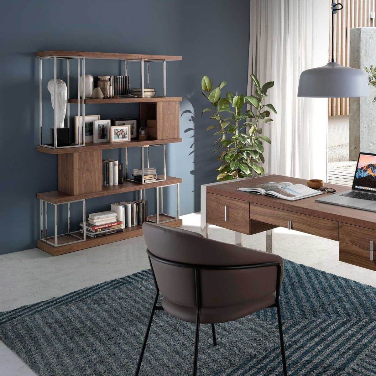 Dió színű furnérozott fa polcrendszer. Krómozott rozsdamentes acél szerkezet.