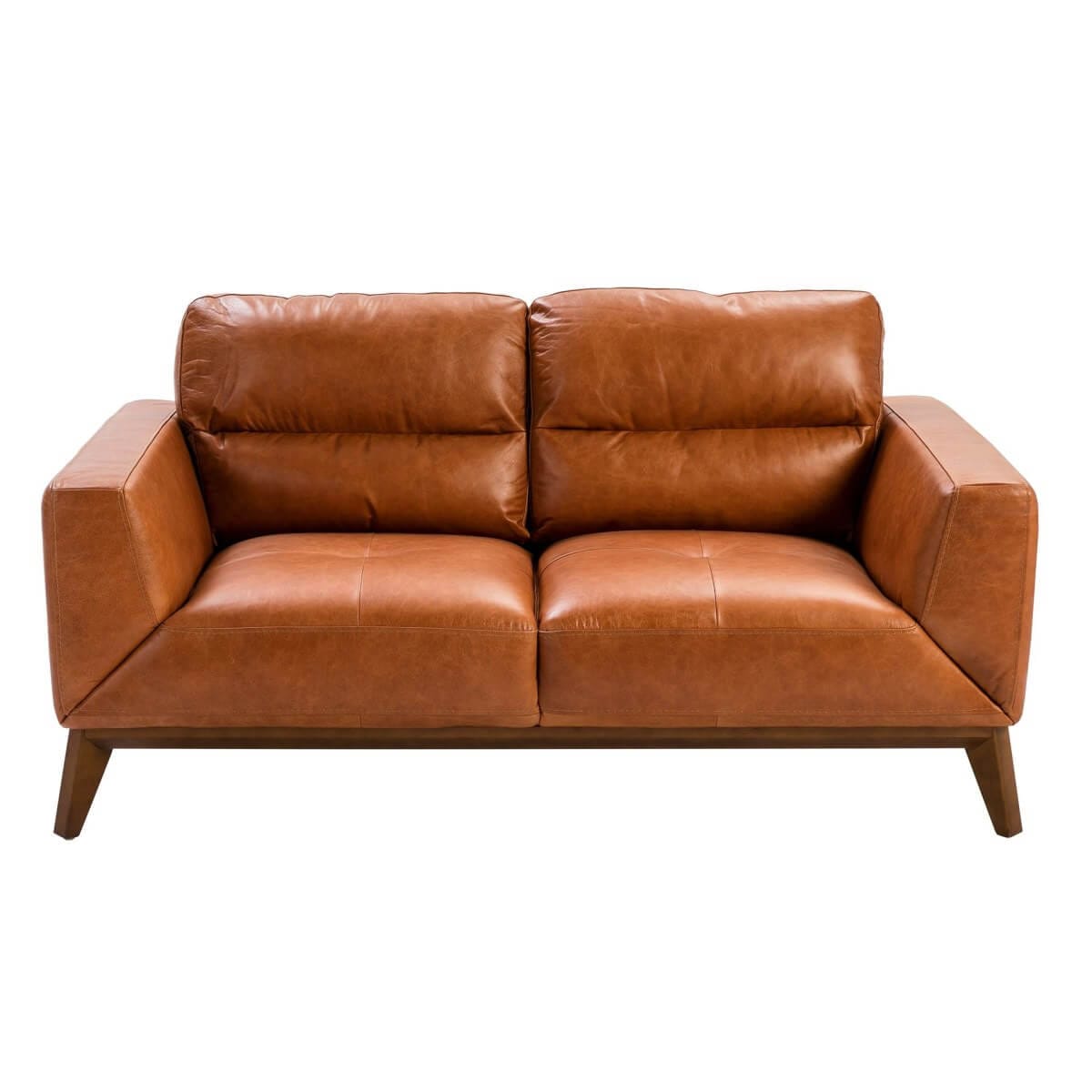Modern dizájnú, kétszemélyes kanapé, barna marhabőrrel kárpitozva. Stílusának és dió színű fa lábainak köszönhetően ez a kanapé az avantgárd és elegancia érzetét kelti otthonában.