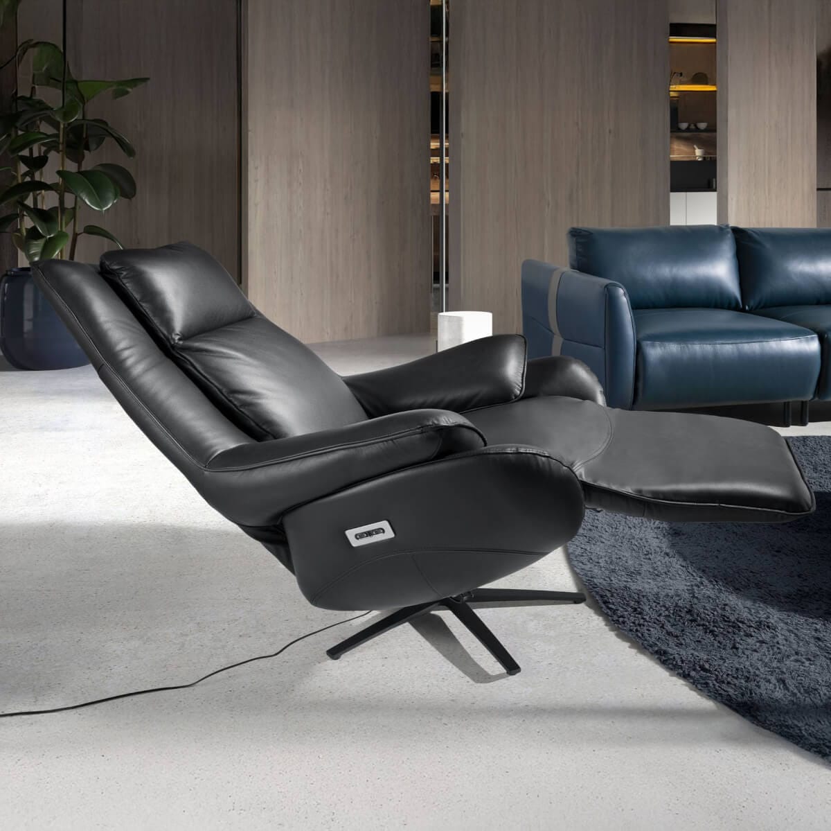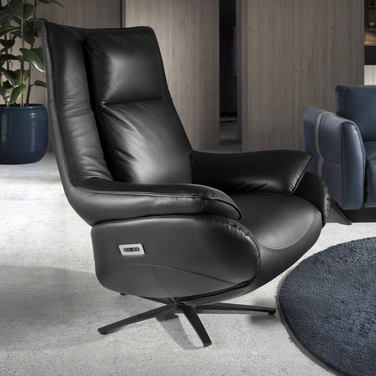 Forgófotel modern dizájnnal, karfákkal, fekete marhabőrrel kárpitozott ülőfelülettel és háttámlával. Stílusának és fekete epoxigyantás rozsdamentes acél lábainak köszönhetően ez az elektromos relax mechanizmussal ellátott forgófotel ideális a stílus és a kényelem közötti tökéletes egyensúly megteremtéséhez.
