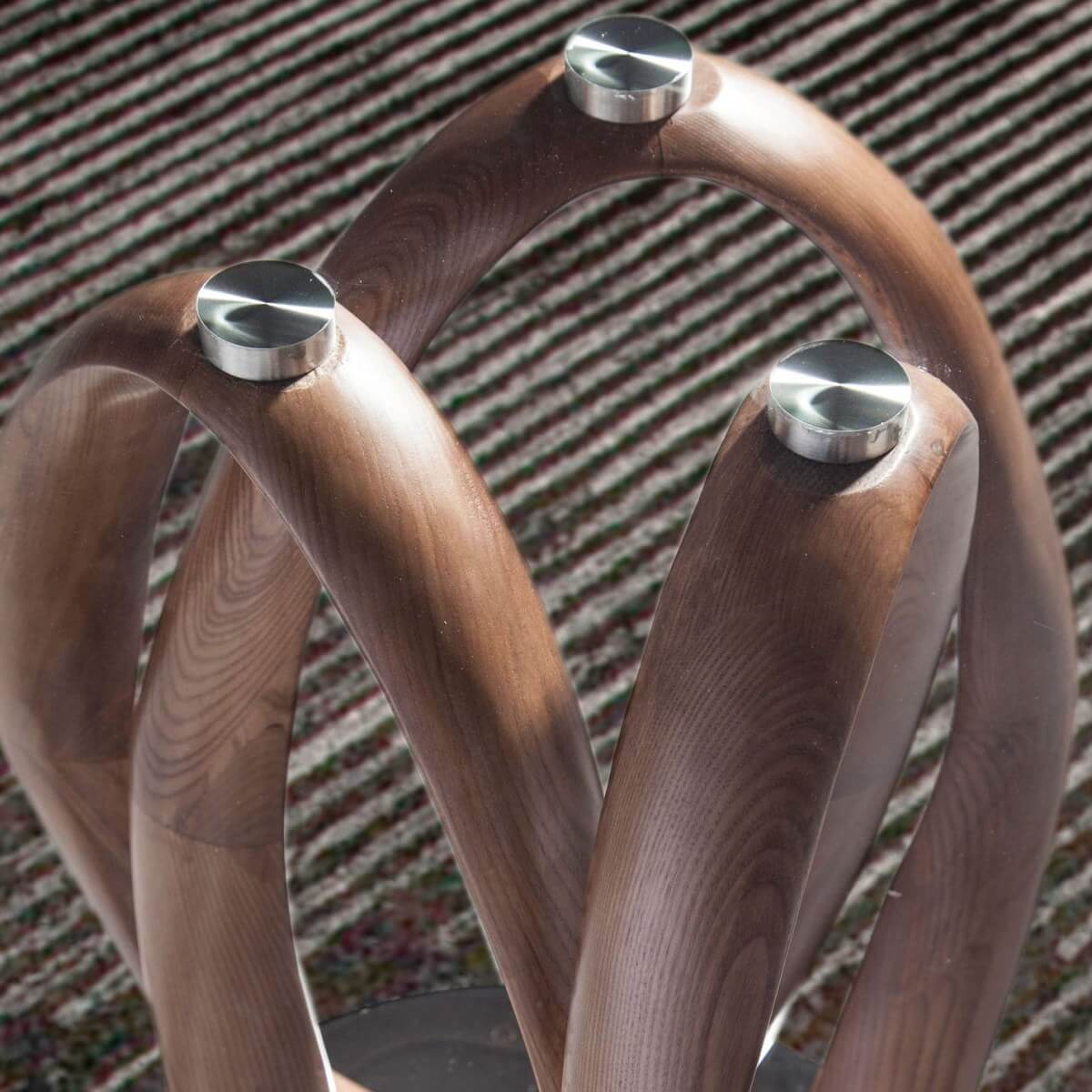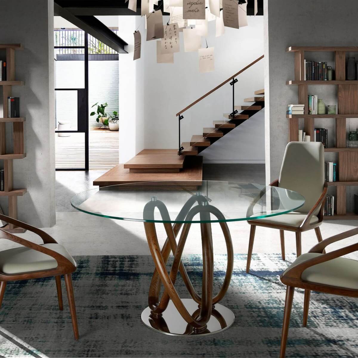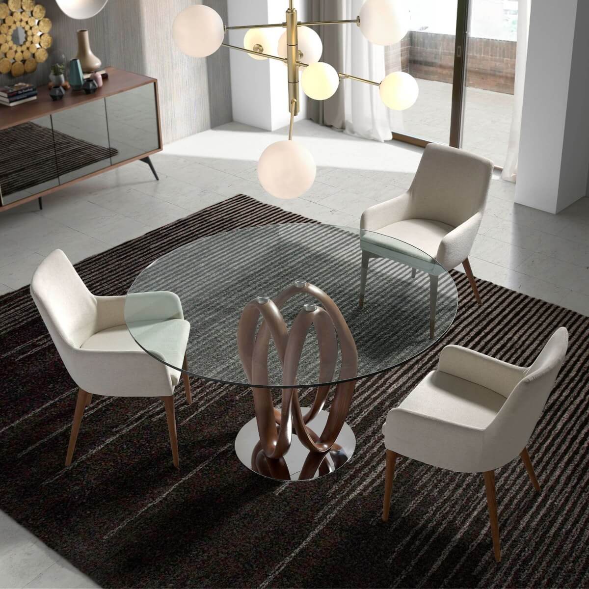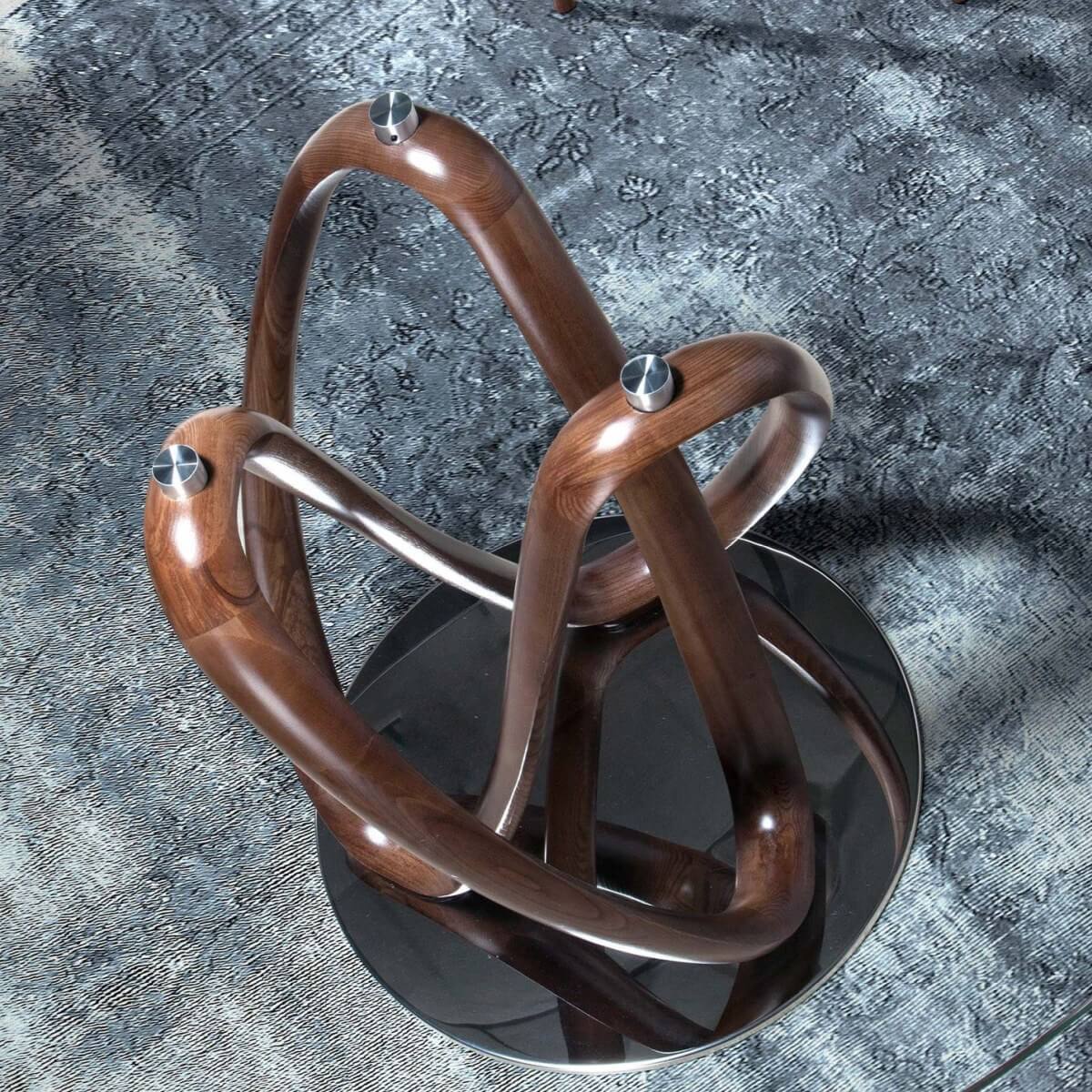 Modern kerek étkezőasztal fix edzett üveglappal. Eredeti dió színű falábai és krómozott rozsdamentes acél talpa kulcsfontosságú elemei a dizájn kiemelésének.