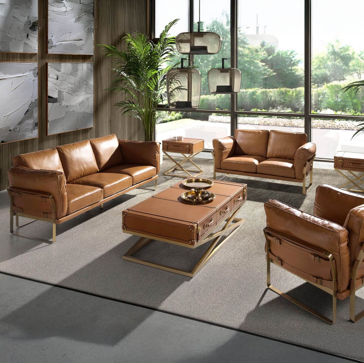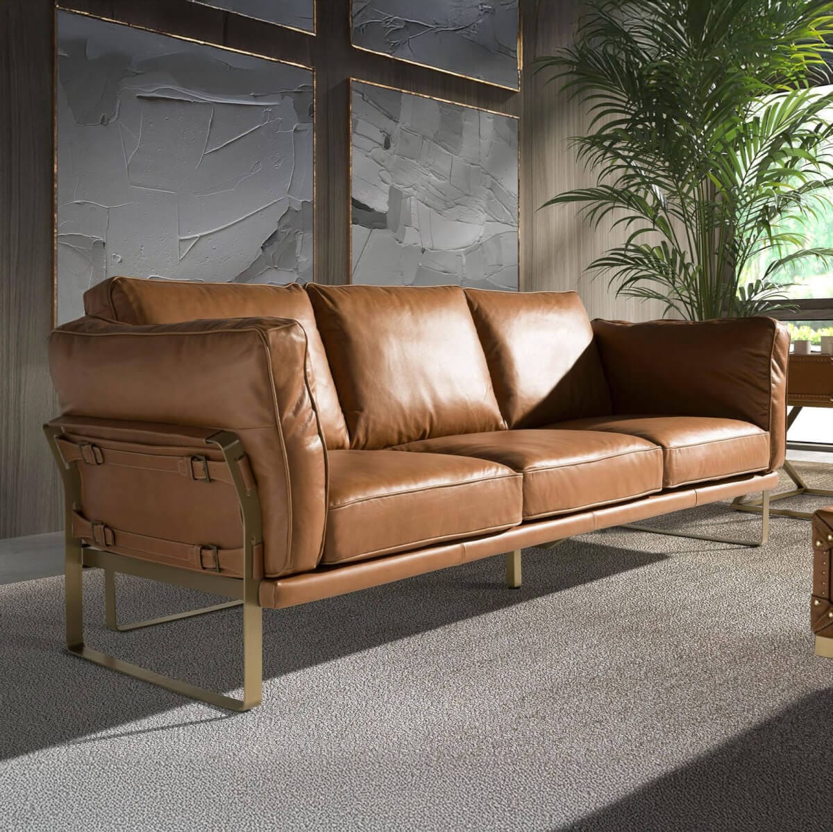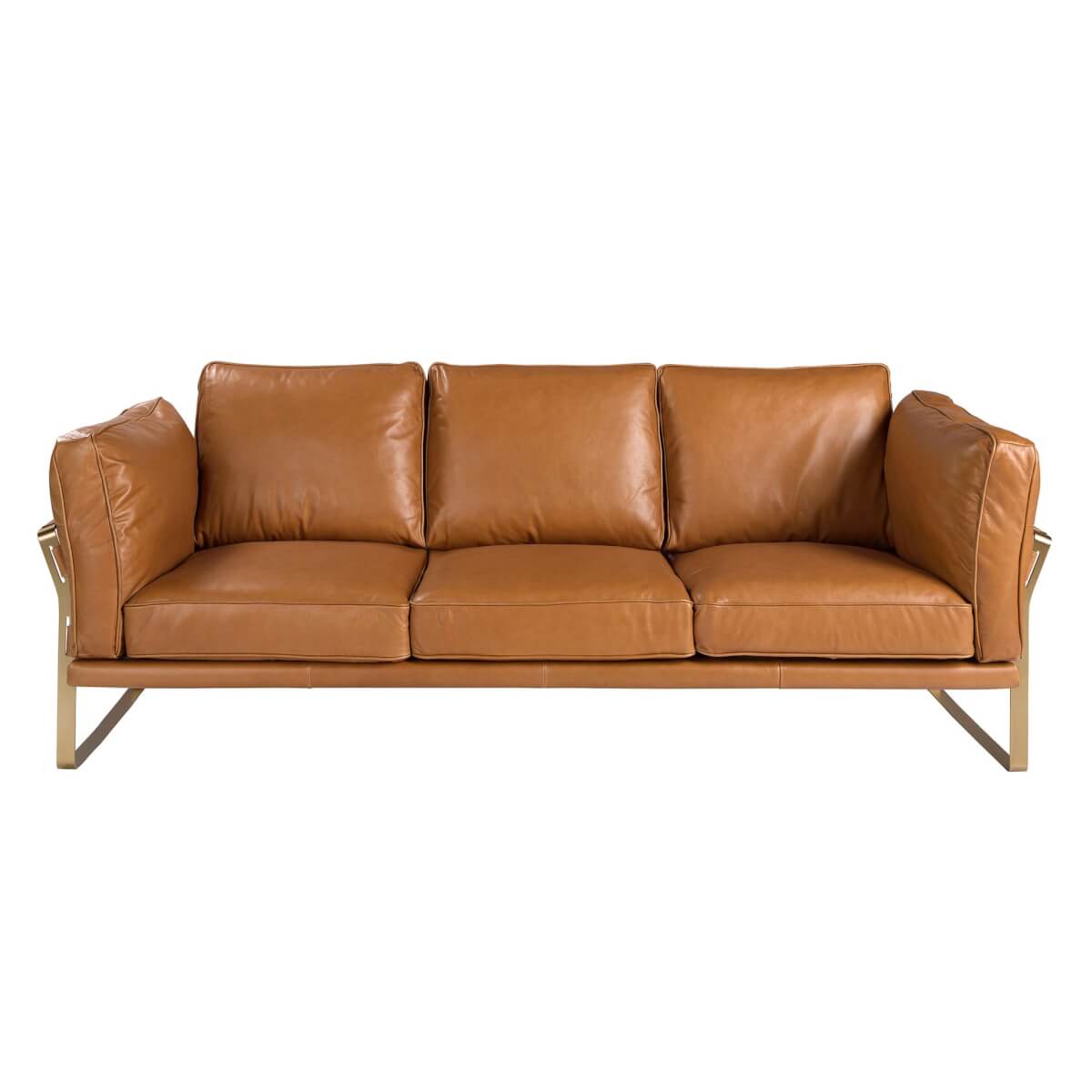 személyes, modern dizájnú, teve színű marhabőrrel kárpitozott kanapé. Stílusának és arany színű rozsdamentes acél lábainak köszönhetően ez a kanapé az avantgárd és elegancia érzetét kelti otthonában. A termék méretei: 222 x 90 x 84 cm. – Az 1,25 mm vastag marhabőr kárpit kiváló minősége nemcsak eleganciát és különlegességet kölcsönöz neki, hanem nagyfokú tartósságot és kényelmet is biztosít. – Minden kanapénk a legmagasabb minőségű anyagokból készül, masszív belső szerkezettel, tömör természetes fenyőfából. – Az eredeti, a szerkezet köré tekeredő pántok egyedi kialakítása egyedi és exkluzív megjelenést kölcsönöz neki, így ideális darab a modern stílusban.