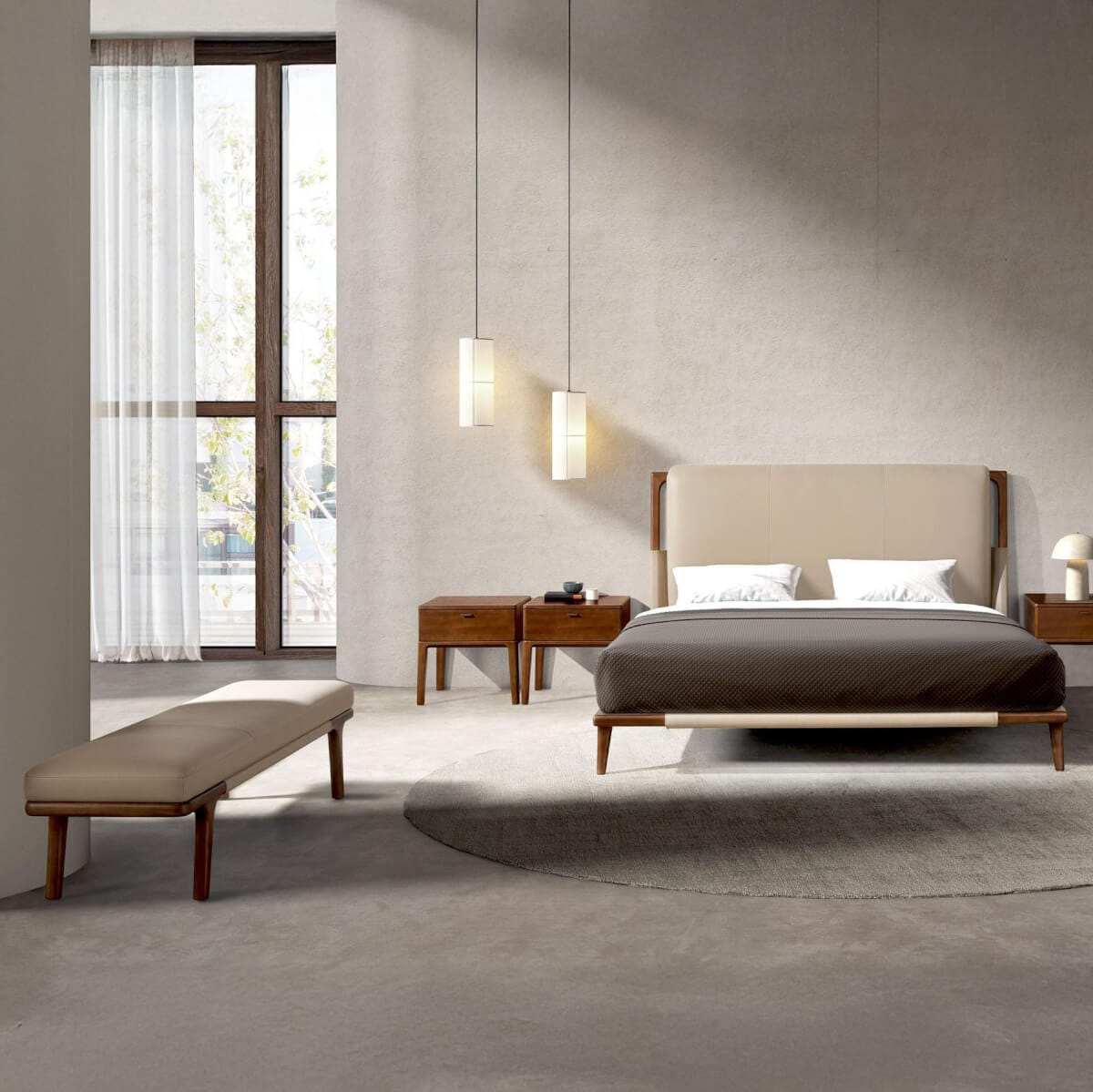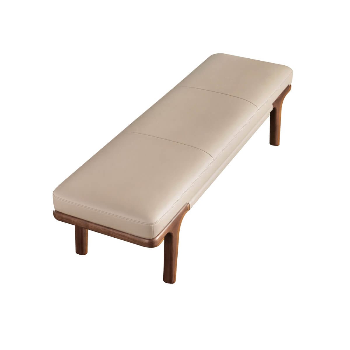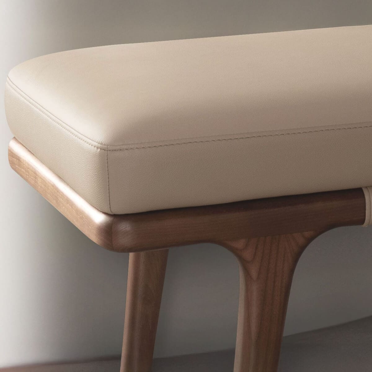 Modern dizájnú pad nercbőrrel kárpitozott ülőfelülettel. Sötét dió színű fa lábai avantgárd, mégis időtlen stílusukban kötelező darabká teszik hálószobájában.