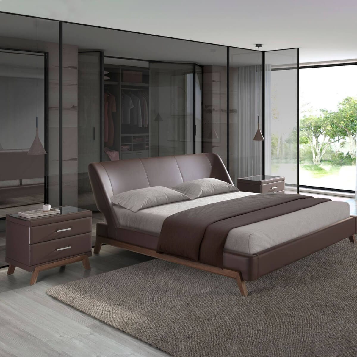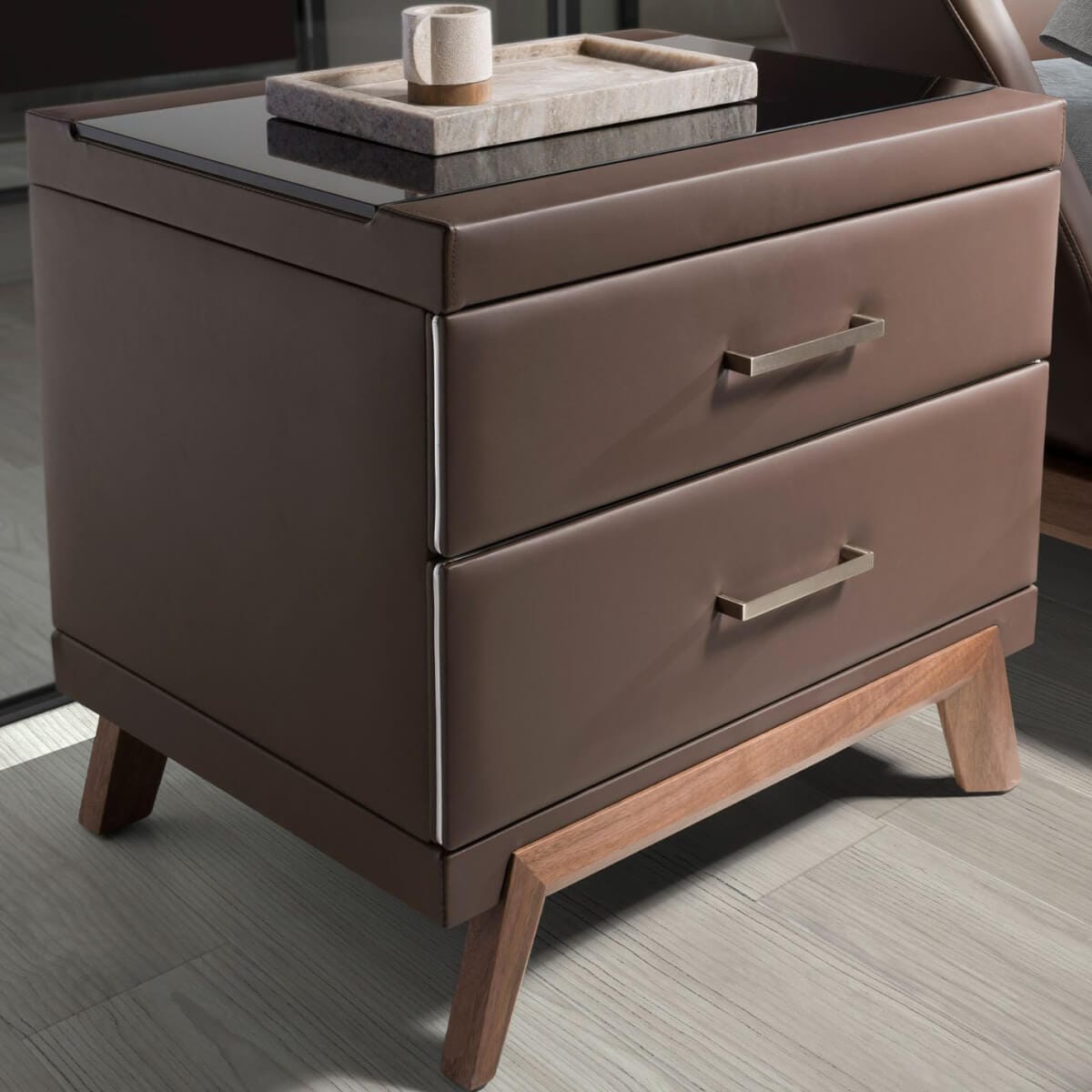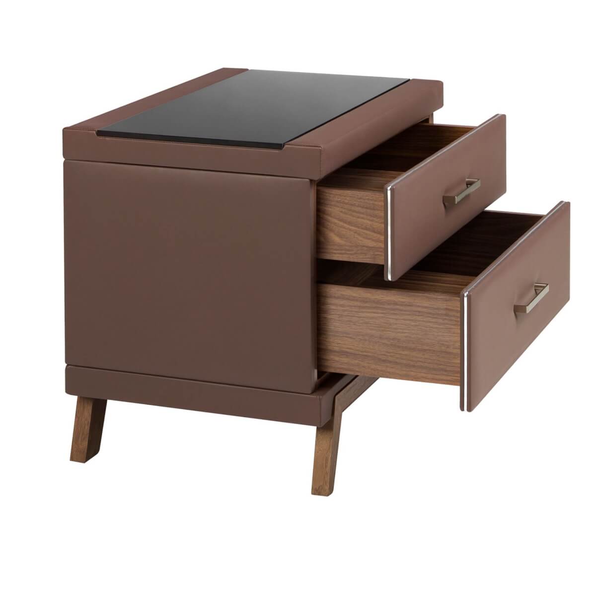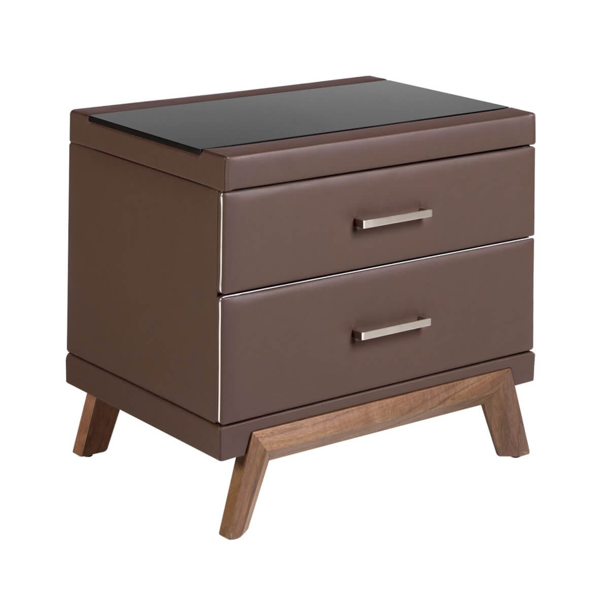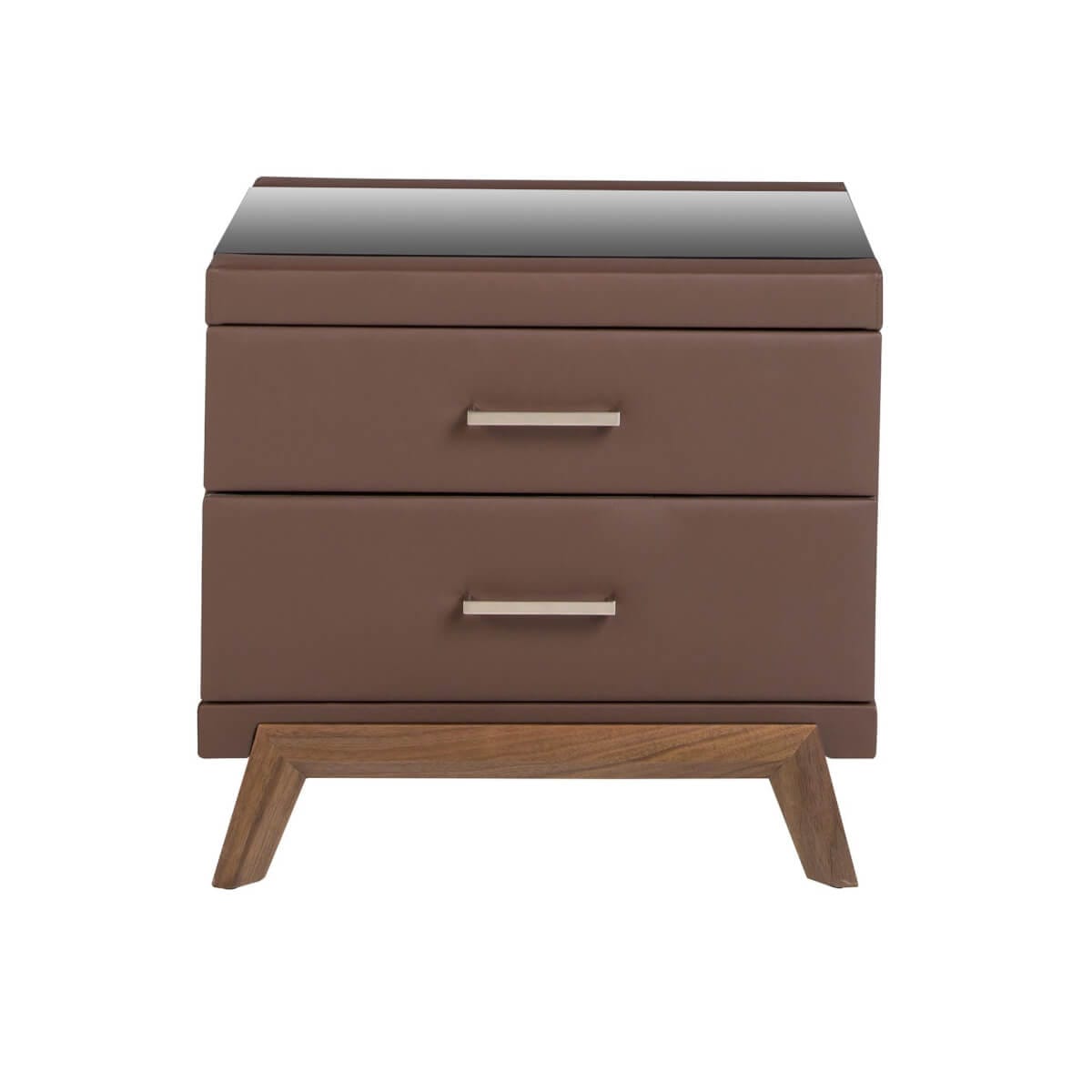 Modern dizájnú éjjeliszekrény natúr dió furnérozott fa szerkezettel, csokoládébarna műbőrrel kárpitozva és eredeti natúr dió furnérozott fa lábakkal. Elegáns fekete színezett üveglapjának köszönhetően azt a kifinomult megjelenést éri el, amit szobáiban keres. Bőséges tárolóhellyel rendelkezik 2 fiókkal, húzófüles nyitással és lágyan záródó rendszerrel. A termék méretei: 60 x 46 x 56 cm. – Az eredeti, csokoládébarna műbőrrel kárpitozott éjjeliszekrény anyaga azt a különleges és modern hatást kölcsönözi hálószobájának, amit keres. – A masszív, dió színű fa lábkeret tökéletes választássá teszi, ha tartós dizájnt és bútort keres otthonába. – Praktikus és funkcionális, a tárolóhelynek köszönhetően mindent a helyén tarthat, így kiküszöböli a vizuális zajt a hálószobában. – Krómozott rozsdamentes acél oldalsó részleteivel és fekete edzett üveglapjával ez a dohányzóasztal a pihenőhelyiség dekorációjának kulcsfontosságú darabjává válik.