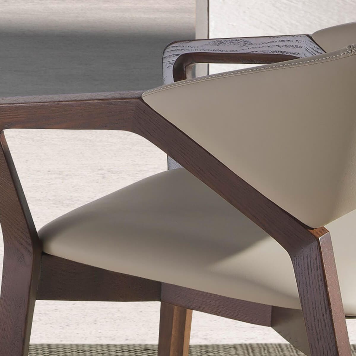 Modern dizájnú karfás szék, nercbőrrel kárpitozott ülőfelülettel és háttámlával. Dió színű fa lábai avantgárd, mégis időtlen stílusukban kötelező darabbá teszi konyhájában vagy étkezőjében.