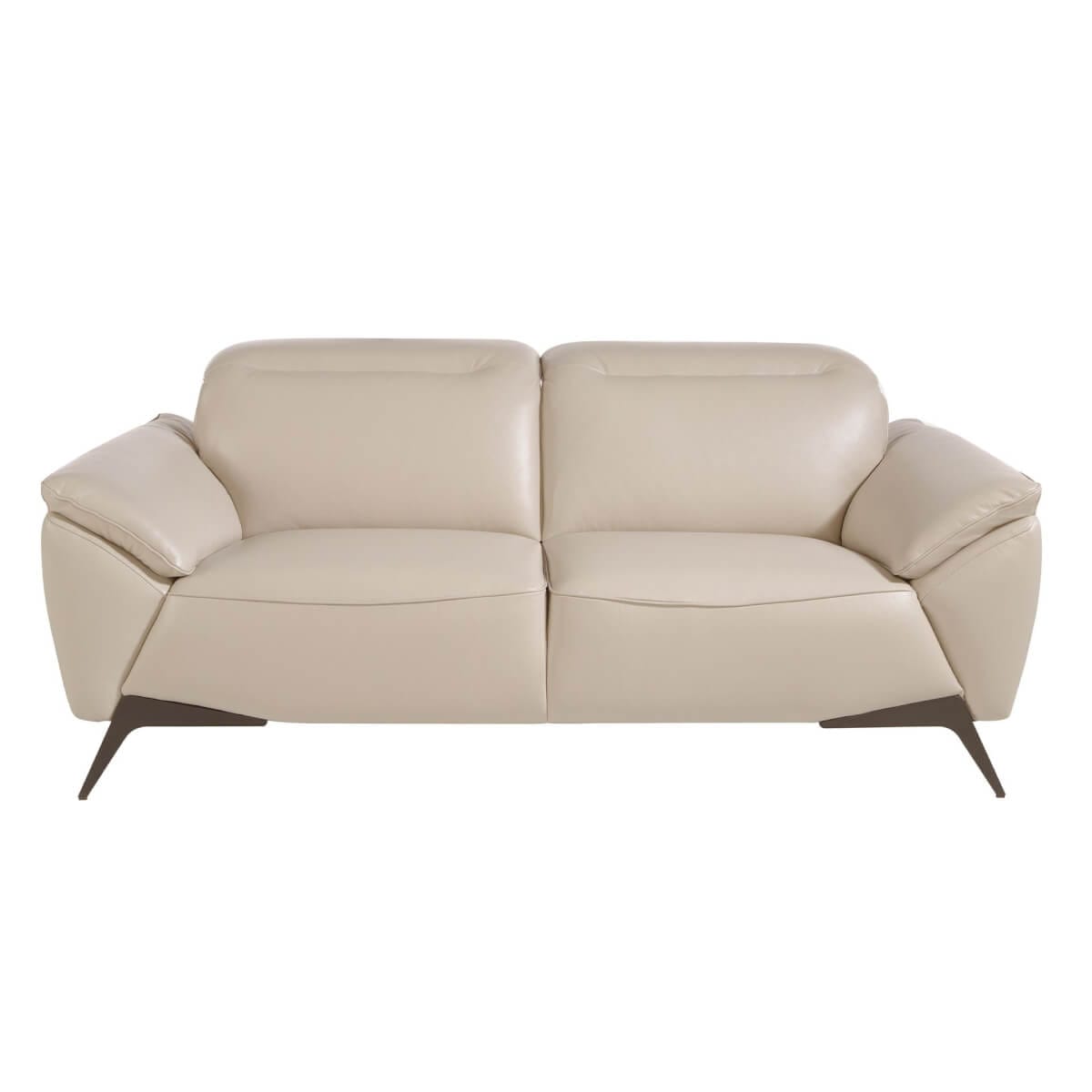 Modern dizájnú, 2 személyes kanapé, bézs szürke marhabőrrel kárpitozva, fejtámlával a nagyobb kényelem érdekében. Stílusának és fekete rozsdamentes acél lábainak köszönhetően ez a kanapé az avantgárd és elegancia érzetét kelti otthonában. Termék méretei: 191 x 107 x 102 cm. – Az 1,5 mm vastag marhabőr kárpitozás kiváló minősége nemcsak eleganciát és különlegességet kölcsönöz neki, hanem nagy tartósságot és kényelmet is. – A független, artikulált fejtámlák extra kényelmet és alkalmazkodóképességet biztosítanak, anélkül, hogy elhanyagolnák a legmodernebb stílust. – Minden kanapénk a legmagasabb minőségű anyagokból készül, masszív belső szerkezettel, tömör természetes fenyőfából.