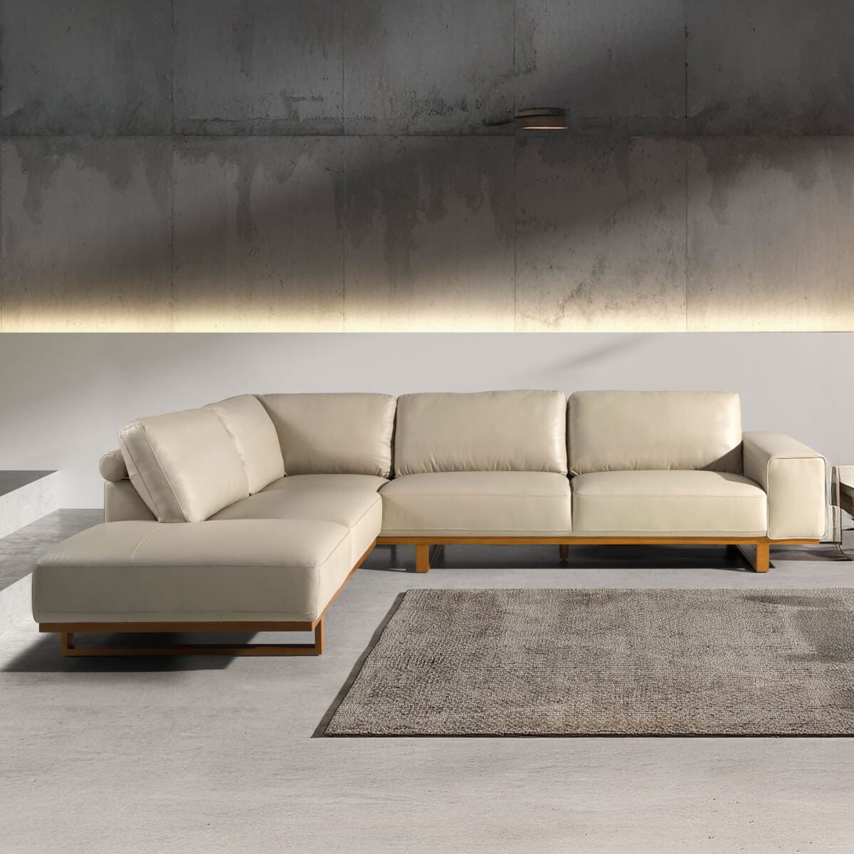 személyes bal oldali sarokkanapé modern dizájnnal, homokszínű marhabőrrel kárpitozva. Stílusának és mézszínű fa lábainak köszönhetően ez a kanapé az avantgárd és elegancia érzetét kelti otthonában. Termék méretei: 316 x 252 x 82 cm. – Az 1,5 mm vastag marhabőr kárpitozás kiváló minősége nemcsak eleganciát és különlegességet kölcsönöz neki, hanem nagy tartósságot és kényelmet is. – Minden kanapénk a legmagasabb minőségű anyagokból készül, masszív belső szerkezettel, tömör természetes fenyőfából. – A háttámla párnák levehetők és cipzáras rendszerrel levehetők.