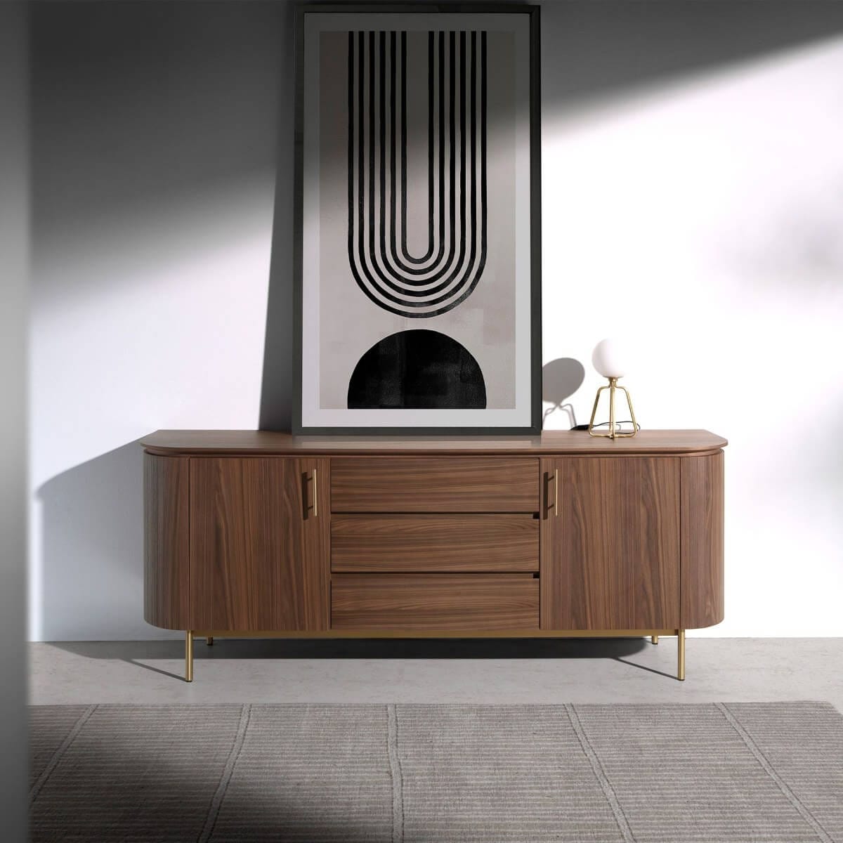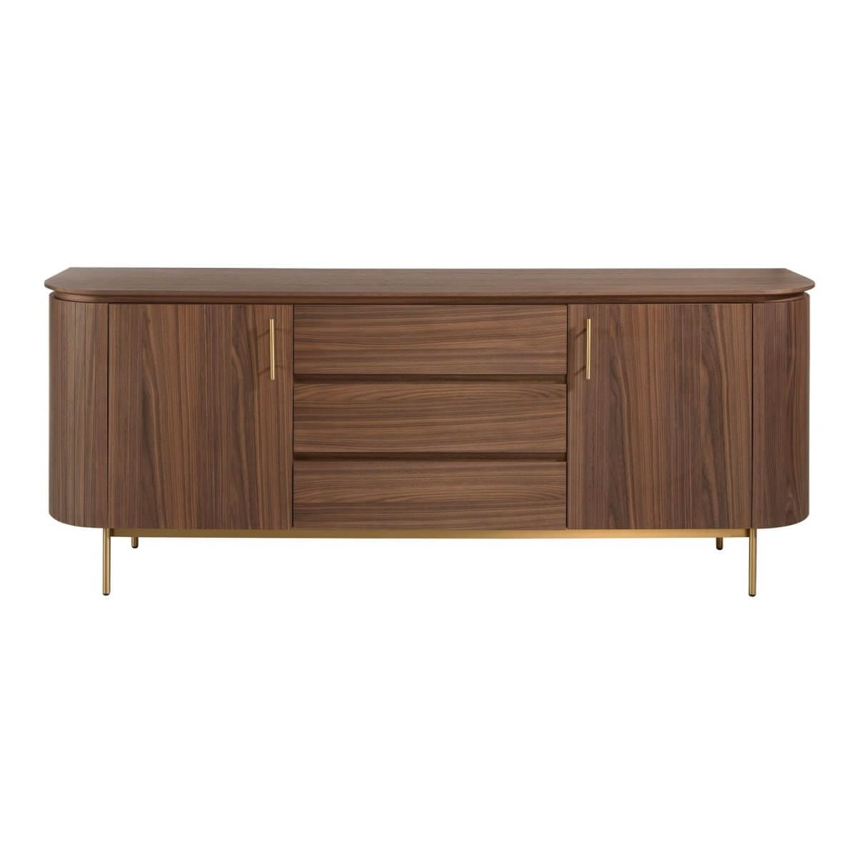 Modern dizájnú tálalószekrény natúr diófa furnérral borított fa szerkezettel és eredeti, polírozott, arany színű rozsdamentes acél lábakkal. Nagy tárolóhellyel rendelkezik, 3 puha záródású és nútféderes nyitású fiókkal, valamint 2 puha záródású és nútféderes nyitású ajtóval.