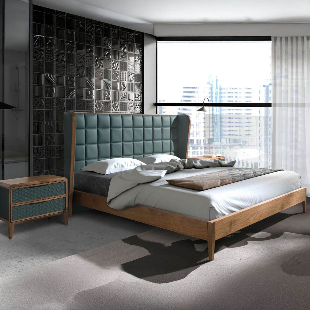 Modern dizájnú franciaágy eredeti sötétzöld műbőr fejtámlával és natúr diófa furnérozott fa szerkezettel. Kulcsfontosságú darab hálószobájába, amellyel elegáns és otthonos stílust kölcsönözhet magának. Kényelmes, fenyőfából készült ágyrácsot is tartalmaz.