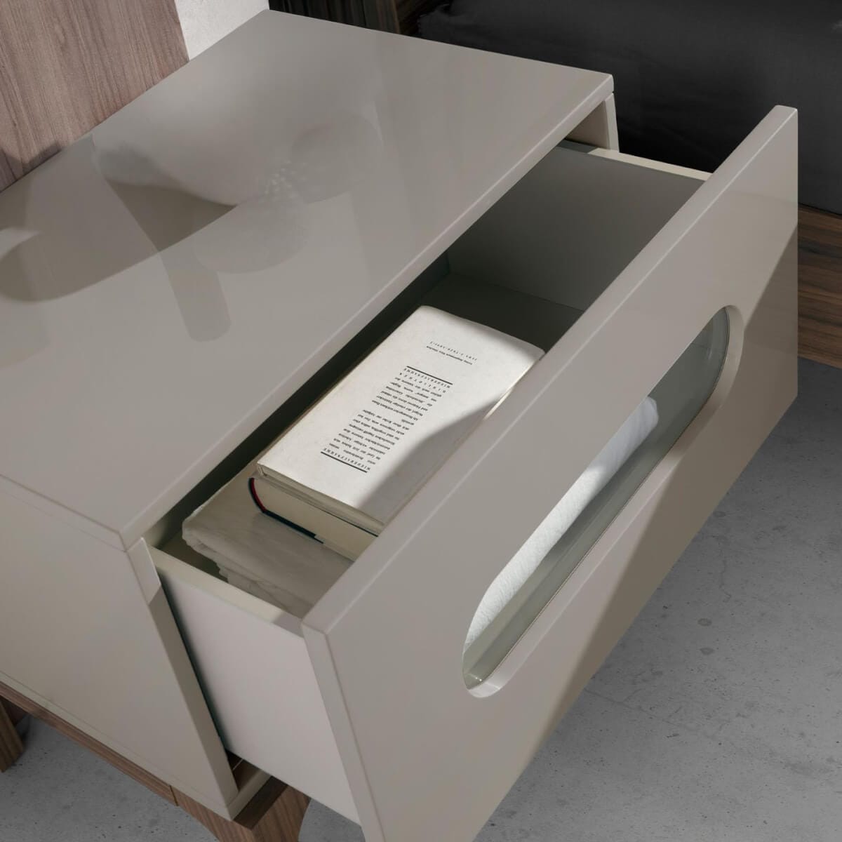 Modern dizájnú éjjeliszekrény szürke MDF fa szerkezettel és eredeti dió színű fa lábakkal. Az éjjeliszekrény belső világítása meleg és nyugodt légkört teremt, miközben jobban rálát a bútor belsejére. Eredeti edzett üveg részletei tökéletes stílust kölcsönöznek nappalijának. Nagy tárolóhellyel rendelkezik, 1 fiókkal, körmös nyitórendszerrel és lágyan záródó rendszerrel. A termék méretei: 60 x 41 x 51 cm. – Mind a lakkozott felület, mind az egyenes, modern dizájn teszi ezt az éjjeliszekrényt tökéletes darabjává hálószobájába. – A masszív dió színű fa lábkeret tökéletes választássá teszi, ha tartós dizájnt és bútort keres otthonába. – Egyenes vonalvezetésű kialakítása nyugalmat és melegséget visz bármely helyiségbe. – Ha csendes és nyugodt otthonra vágyik, ez az éjjeliszekrény nagy tárolóhelyének köszönhetően segít rendet tartani. – Az edzett üveg előlapi lyukkal ellátott elülső fiókkal és a belső LED-világítással ellátott kialakítás egyedi, sokoldalú és teljesen adaptálható kiegészítő bútorrá teszi bármely hálószobába vagy pihenőhelyiségbe.