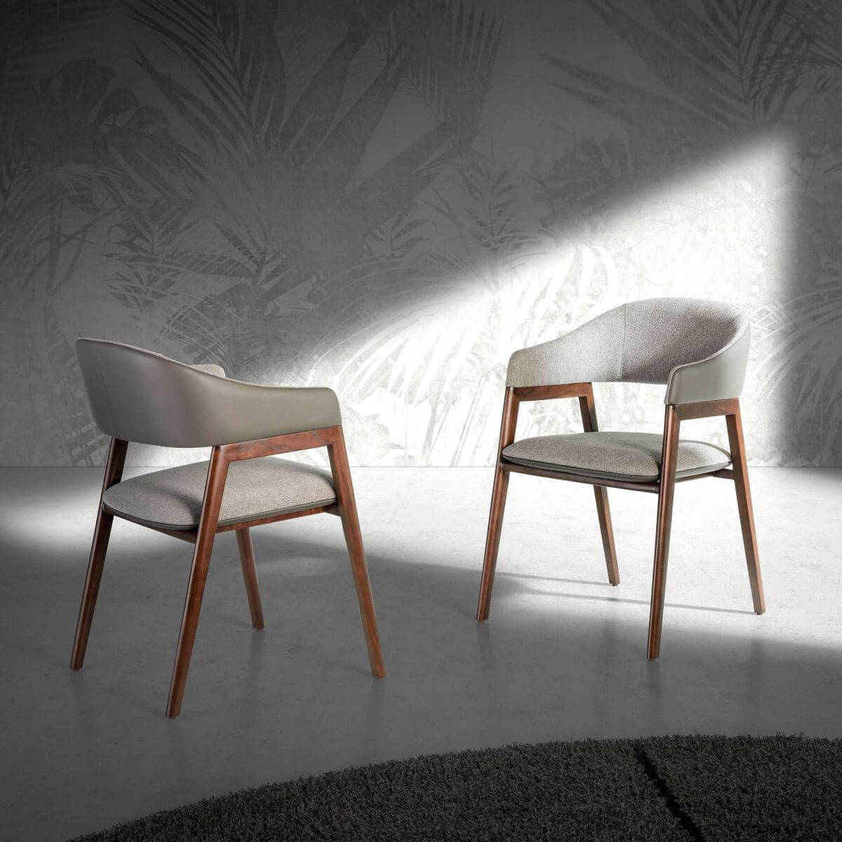 Terra noble szék: modern dizájnú karfás szék szürke szövettel kárpitozott ülőfelülettel és sötét nercbőrrel kárpitozott háttámlával. Dió színű fa lábai avantgárd, mégis időtlen stílusukban kötelező darabbá teszik konyhájában vagy étkezőjében.
