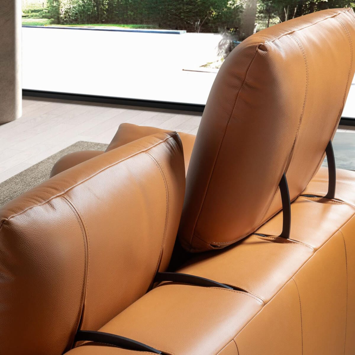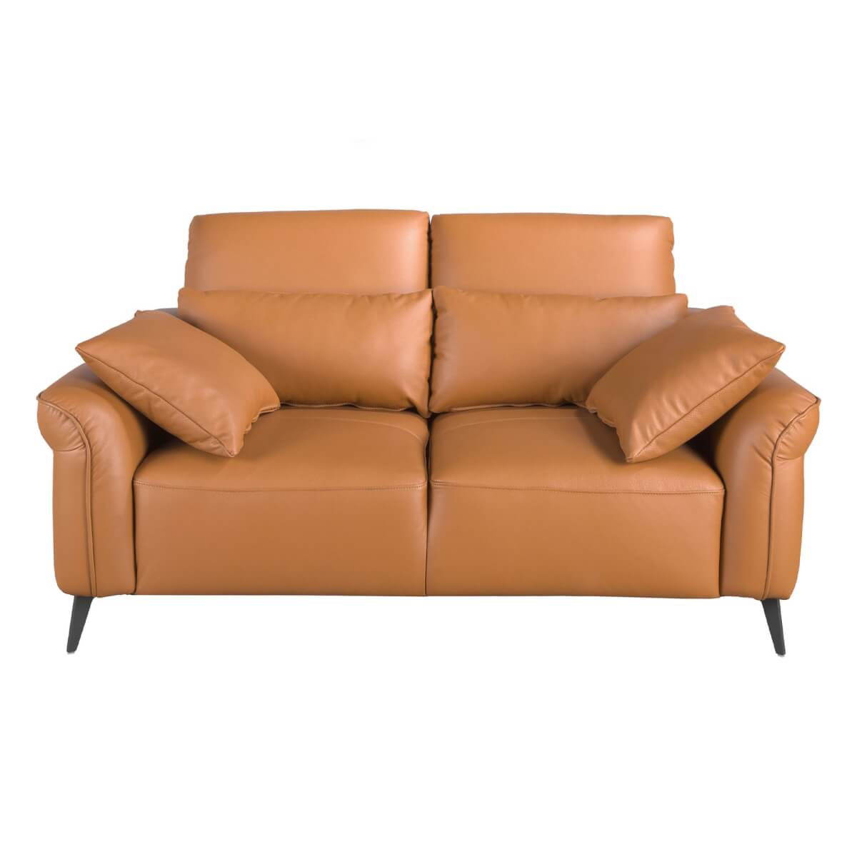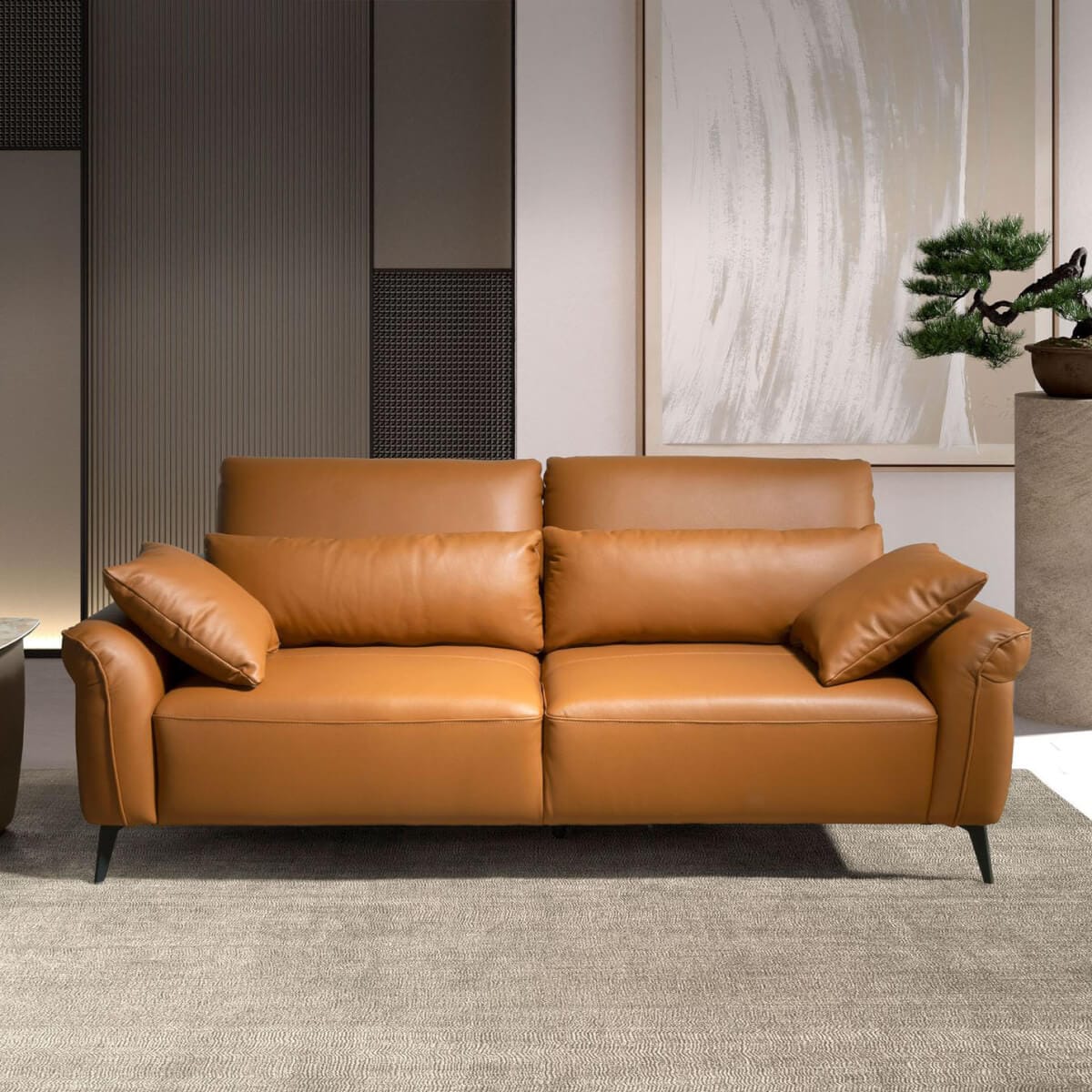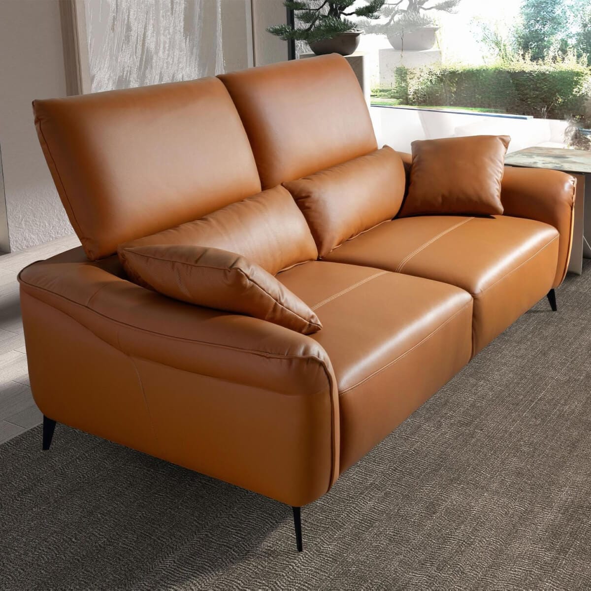 Modern dizájnú, kétszemélyes kanapé, barna marhabőrrel kárpitozva. Stílusának és fekete epoxigyantával festett rozsdamentes acél lábainak köszönhetően ez a kanapé az avantgárd és elegancia érzetét kelti otthonában. A termék méretei: 170 x 107 x 105 cm. – Az 1,25 mm vastag marhabőr kárpit kiváló minősége nemcsak eleganciát és különlegességet kölcsönöz neki, hanem nagyfokú tartósságot és kényelmet is. – Az emelhető fejtámlák extra kényelmet és alkalmazkodóképességet biztosítanak, miközben továbbra is divatosak. – Minden kanapénk a legmagasabb minőségű anyagokból készül, masszív belső szerkezettel, tömör természetes fenyőfából. – Ez a kanapé további, egyedi párnákkal rendelkezik, amelyek harmonikusan kiegészítik a szettet és nagyobb kényelmet biztosítanak.
