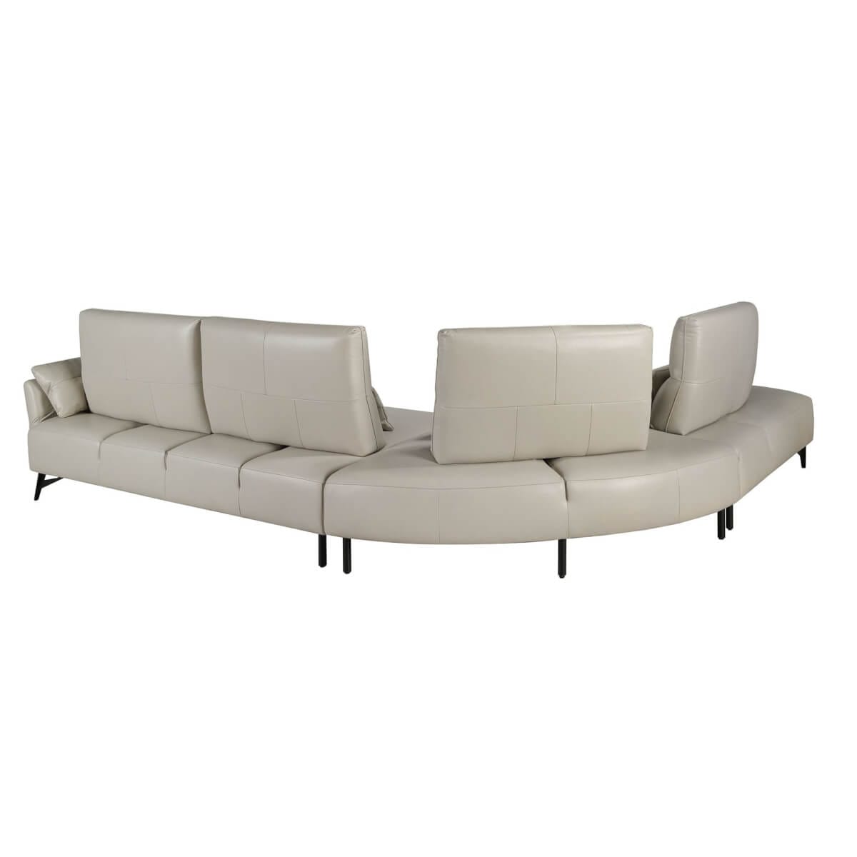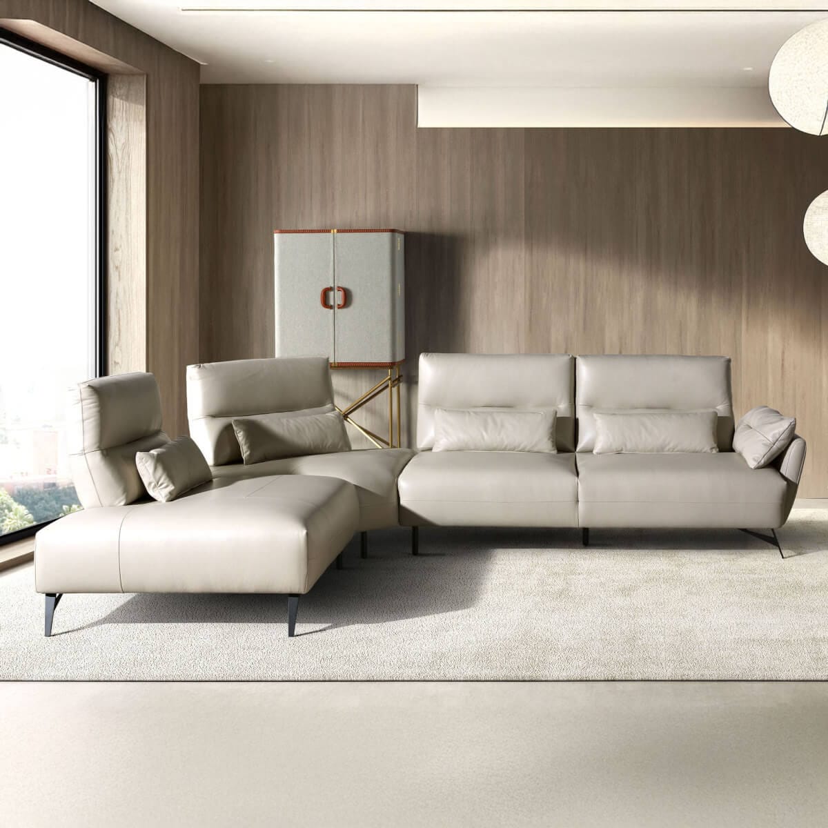 5 személyes bal oldali heverő kanapé modern dizájnnal, homokszínű marhabőrrel kárpitozva. Stílusának és fekete rozsdamentes acél lábainak köszönhetően ez a kanapé egy csipetnyi avantgárd és eleganciát visz otthonába, amire vágyik. Termék méretei: 341 x 254 x 94 cm. – Az 1,5 mm vastag marhabőr kárpitozás kiváló minősége nemcsak eleganciát és különlegességet kölcsönöz neki, hanem nagy tartósságot és kényelmet is. – Minden kanapénk a legmagasabb minőségű anyagokból készül, masszív belső szerkezettel, tömör természetes fenyőfából. – Ez a kanapé további egyedi párnákkal rendelkezik, amelyek harmonikusan teszik teljessé a szettet és nagyobb kényelmet biztosítanak. – A kézzel állítható háttámla lehetővé teszi, hogy a felhasználó igényeihez igazítsa, maximális kényelmet és praktikumot kínálva.
